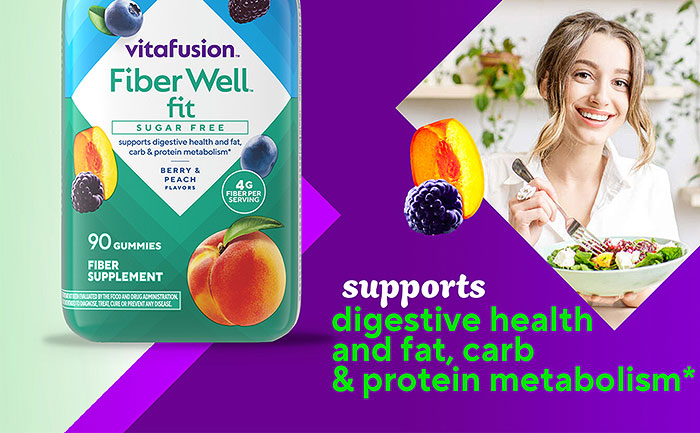 Not only are these gummies packed with 4 grams of fiber per serving, but they also provide six B vitamins per serving to support fat, carbohydrate and protein metabolism.* Best of all, these sugar-free fiber gummies come in peach, raspberry and berry flavors!